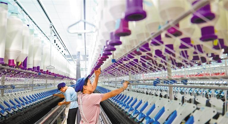 7月29日,职工在宁夏吴忠兴民纺织科技有限公司车间繁忙。该公司坐落吴忠市红寺堡区红寺堡镇弘德村,乡民在家门口完成工作。