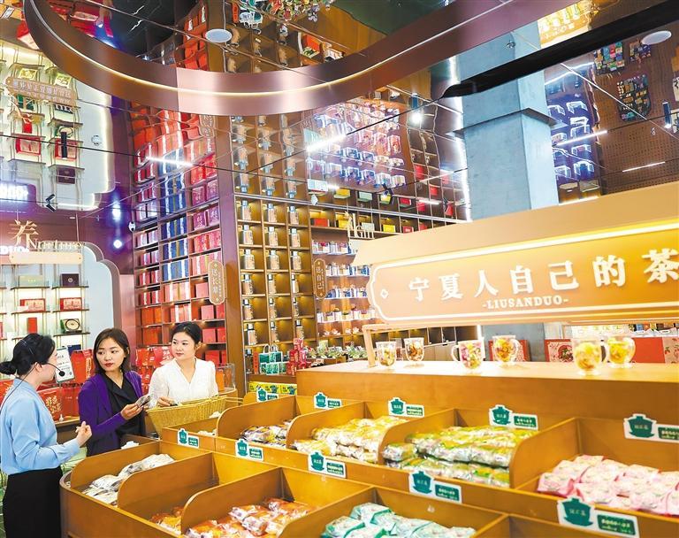 7月30日,吴忠市刘三朵八宝茶非遗体会馆工作人员向顾客介绍八宝茶的前史。近年来,吴忠早茶成为当地的嘹亮招牌,带动了农产品附加值的进步。