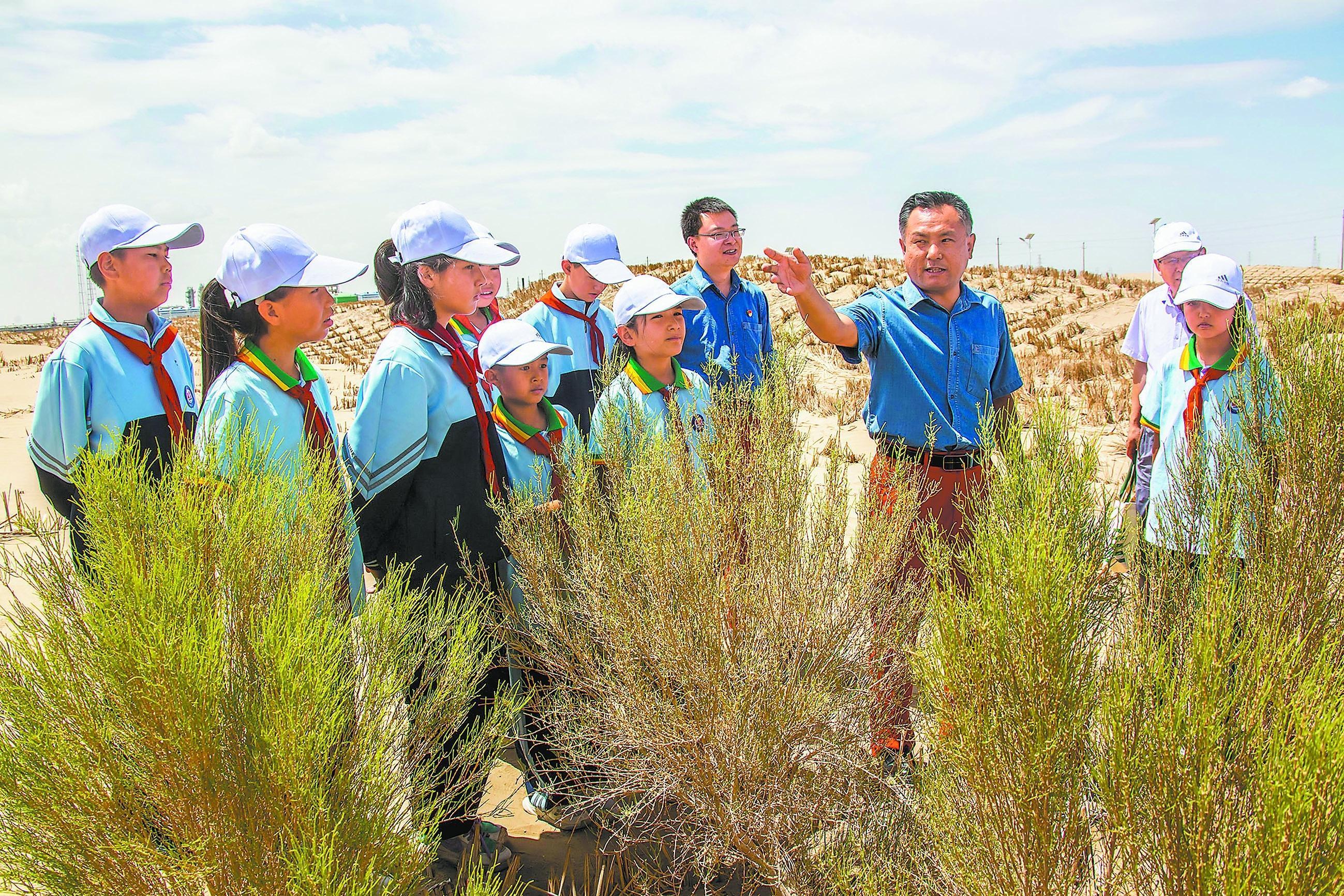 新疆阿克苏地区沙雅县第四小学的学生来到大漠深处,听石油叔叔讲梭梭防护林的故事。李学仁 摄