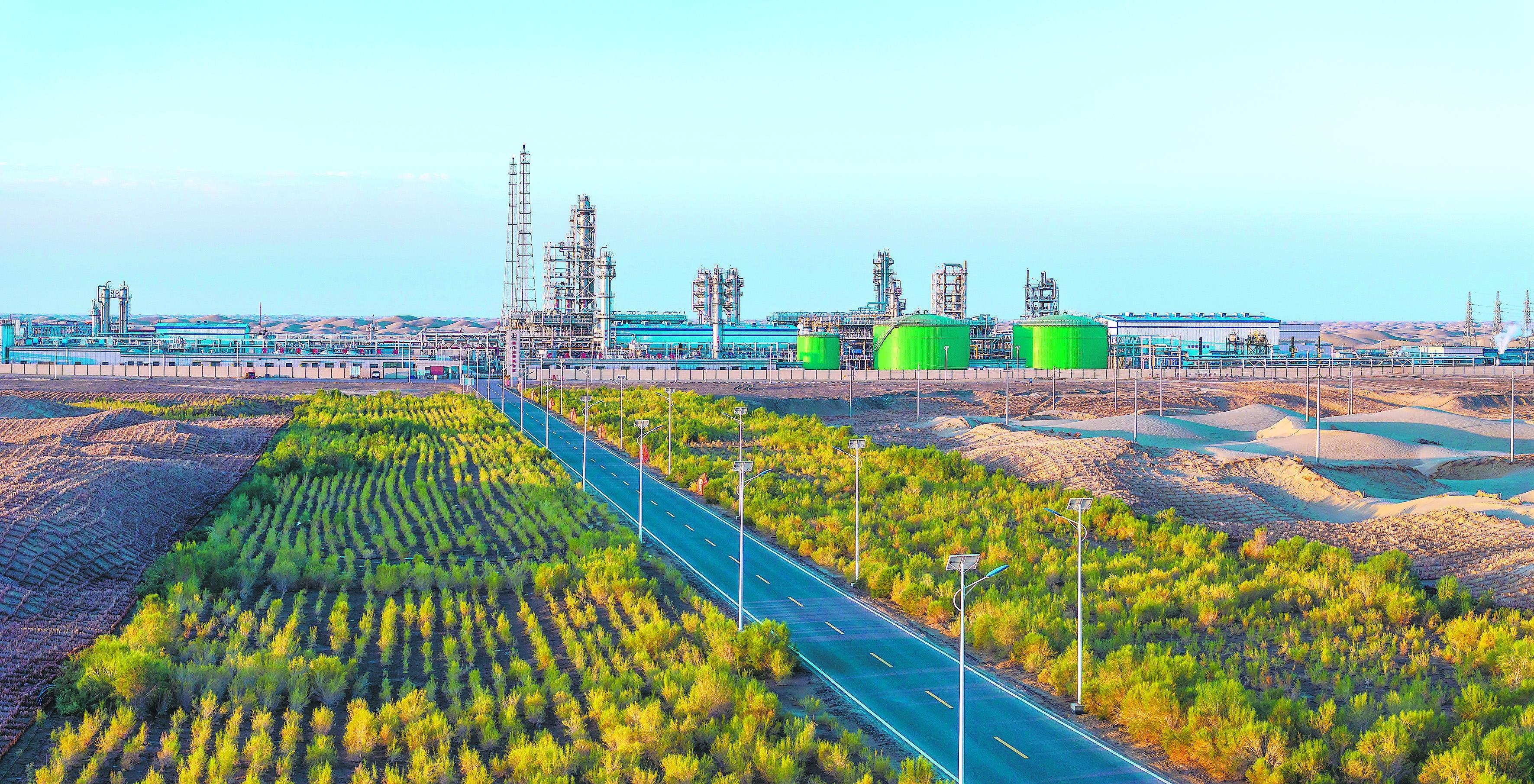 坐落油田骨干道沿线年时刻,周围栽培的梭梭树已长成气候,好像一条“绿围脖”守护着联合站安全出产。李学仁 摄