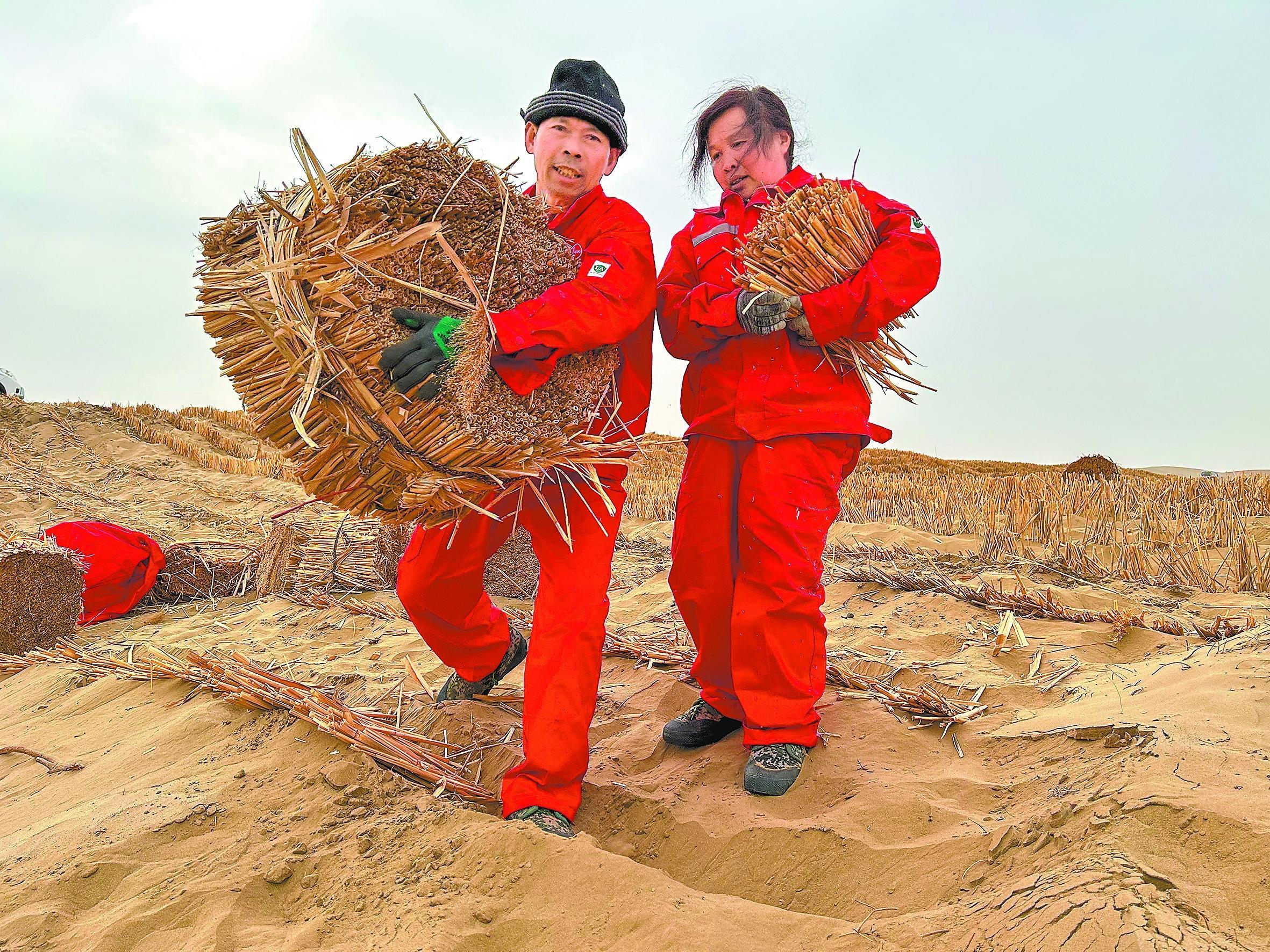 来自四川的代可国、陈六琼配偶已经在塔克拉玛干沙漠编扎草方格10年了。他们说,在这儿拖延尽管辛苦,但能攒下钱,也能看得见沙漠真的在变样。 赵继沛 摄